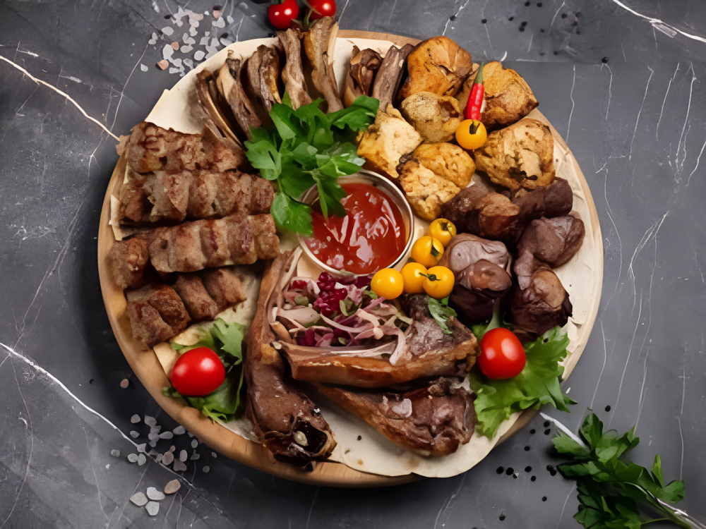 Люля-кебаб из баранины (400 г), баранья корейка (200 г), бараньи семечки (200 г), баранья мякоть (200 г), куриная грудка (220 г), куриные крылышки (400 г), куриная голень (300 г), молодая картошка (300 г), соус (200 г), лаваш (1 шт.) (150 г), лук (150 г)