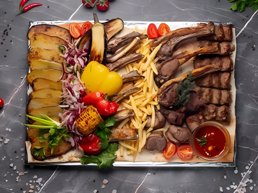 Баранья корейка (400 г), баранья мякоть (400 г), бараньи семечки (400 г), люля-кебаб из баранины (400 г), овощи гриль (500 г), картофель на мангале (500 г), перец на мангале (300 г), помидор на мангале (300 г), соус (300 г), лаваш (2 шт.; 300 г), лук (200 г)