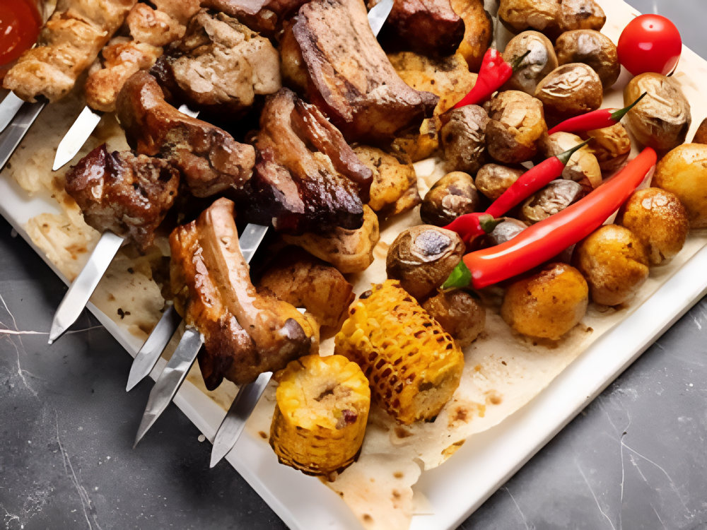 Шашлык из бараньей корейки (600 г), шашлык из бараньих семечек (600 г), люля-кебаб из баранины (400 г), люля-кебаб из курицы (800 г), люля-кебаб из говядины (400 г), люля-кебаб из свинины (400 г), свиная шейка (660 г), свиные ребра (750 г), бедро куриное (500 г), голень куриная (520 г), куриные крылышки (520 г), картофель на мангале (500 г), грибы на мангале (500 г), овощи гриль (500 г), лук (400 г), соус шашлычный (600 г), лаваш (5 шт.) (750 г)