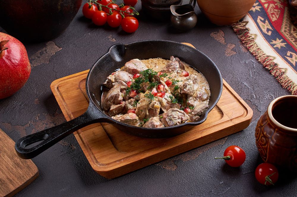 Куриная печень,тушеная в сливочном соусе с красным луком