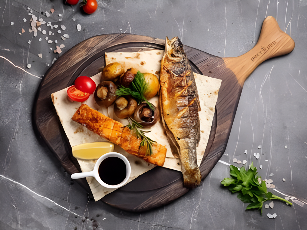 Форель речная (350 г), семга (200 г), грибы (200 г), лимон (35 г), соус (100 г), лаваш (1 шт.; 150 г)