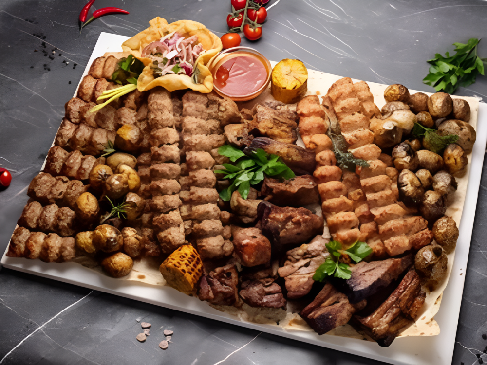 Люля-кебаб из курицы (1,4 кг), люля-кебаб из говядины (1,2 кг), люля-кебаб из свинины (800 г), люля-кебаб из баранины (600 г), свиная шейка (1,1 кг), свиные ребра (1 кг), картофель на мангале (1,25 кг), лук (450 г), соус шашлычный (750 г), лаваш (5 шт.; 750 г)