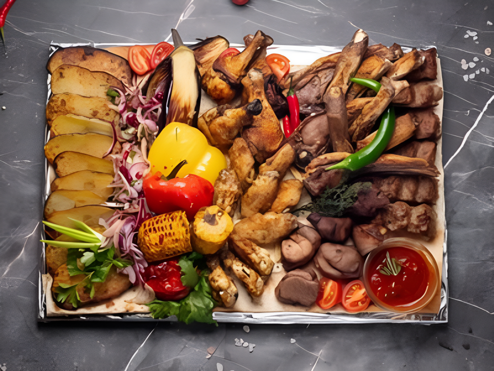 Шашлык из бараньей корейки (600 г), шашлык из бараньих семечек (600 г), шашлык из бараньей мякоти (560 г), люля-кебаб из баранины (400 г), люля-кебаб из курицы (600 г), шашлык из куриной грудки (760 г), шашлык из куриной голени (520 г), шашлык из куриных крылышек (520 г), картофель на мангале (750 г), овощи гриль (500 г), лук (300 г), соус шашлычный (600 г), лаваш (5 шт.; 750