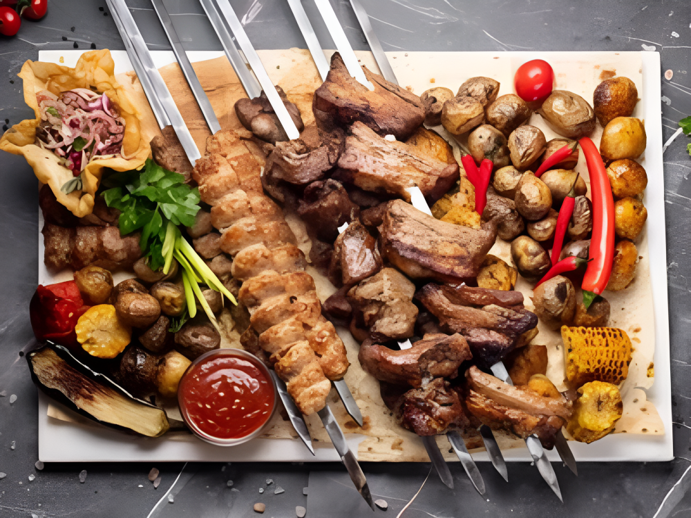 Люля-кебаб из курицы (200 г), Люля-кебаб из говядины (200 г), Люля-кебаб из баранины (200 г), Люля-кебаб из свинины (200 г), Свиная шейка (220 г), Свиные ребра (250 г), Куриная грудка (220 г), Баранья мякоть (200 г), Картофель на мангале (750 г), Овощи гриль (500 г), Лук (250 г), Шашлычный соус (450 г), Лаваш (3 шт.; 400 г)