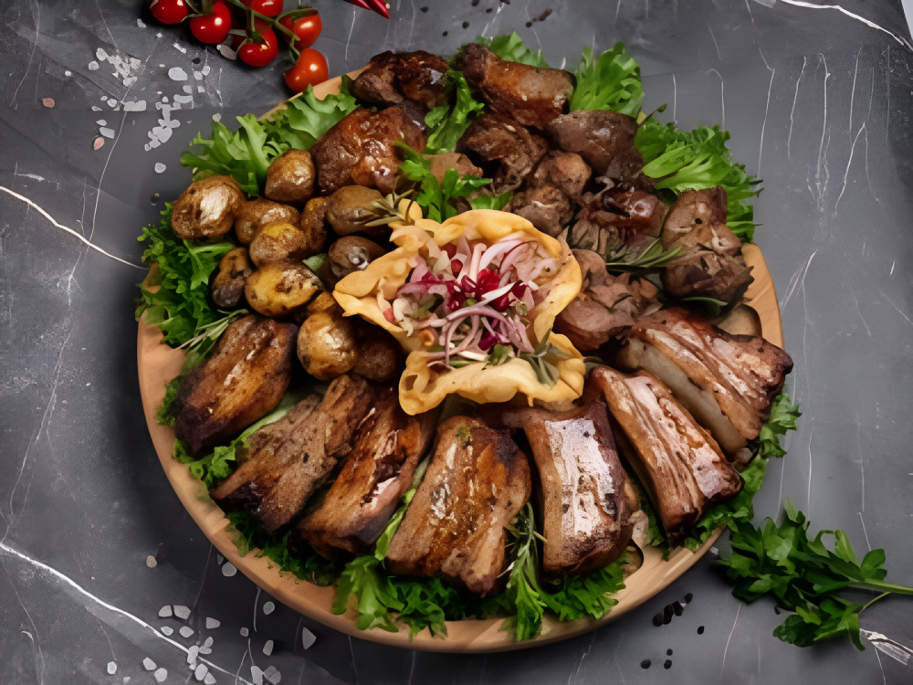 Свиная шейка (440 г), свиные ребра (500 г), картофель на мангале (500 г), соус шашлычный 300 г), лук (150 г), лаваш (2 шт.; 300 г)