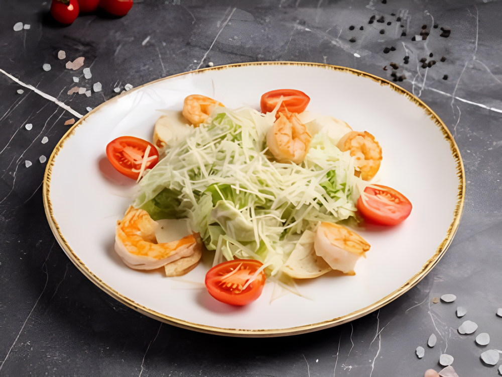 Салат айсберг, томат, сыр пармезан, гренки, курица