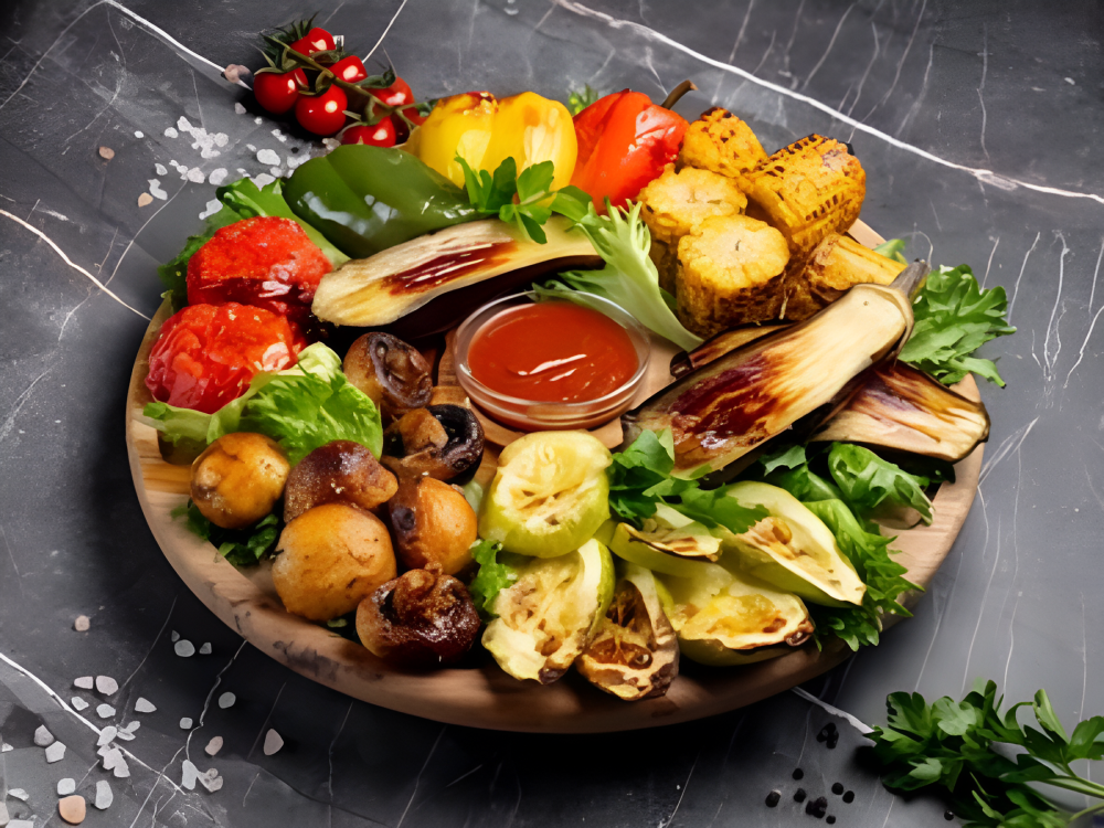 Грибы (400 г), кукуруза (300 г), овощи гриль (500 г), перец на мангале (300 г), томаты на мангале (300 г), картошка молодая (750 г), лук и зелень (200 г)