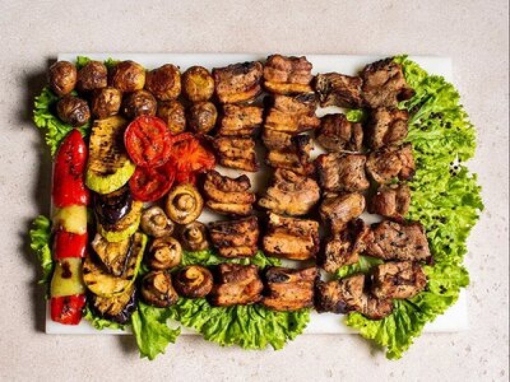 Шашлык из свиной шейки (660 г), шашлык из свиных ребер (500 г), овощи гриль (перец, баклажан, томаты, кабачок) (250 г), картофель на мангале (750 г), грибы на мангале (400 г), лук (150 г), соус шашлычный (4 шт.) (200 г), лаваш армянский (2 шт.) (320 г)
