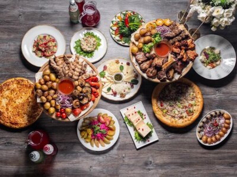 Шашлычное ассорти: куриная голень (1,8 кг), крылья (1,9 кг), свиная шея (1,8 кг), свиные ребра (1,9 кг), свиная корейка (1,5 кг), люля свиная (800 г), куриная (1 кг), говяжья (800 г), картошка (1,9 кг), хачапури по-мегрельски (2 шт.; 30 см) (1 кг), кубдари (500 г), ассорти солений (800 г), овощной салат (1,5 кг), салат Оливье (1,5 кг), салат Цезарь с курицей (1,5 кг), сырное ассорти (800 г), сельдь с картошкой (600 г), морс клюквенный собственного производства (10 л), лаваш (10 шт.), соус шашлычный (24 шт.; 50 г), лук и зелень (700 г)